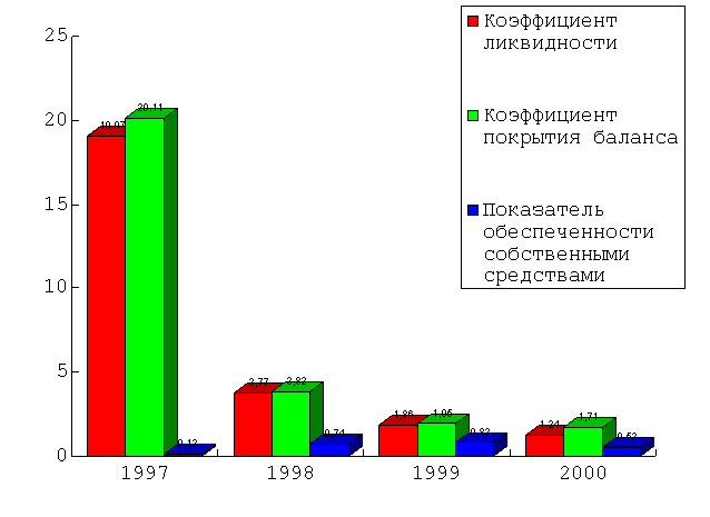Рис. 4. Динамика изменения коэффициента ликвидности, коэффициента покрытия баланса и показателя обеспеченности собственными средствами АО “Альфа” за период с 1997 по 2000 г.