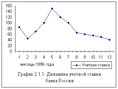 В 1996 году, учетная ставка Банка России снижалась, за исключением периода с мая по июль, когда она «перевалила» за 100%. Многие банки России ведут свою процентную политику в зависимости от изменения этой ставки.