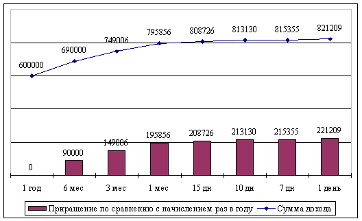 По данным диаграммы наиболее ощутимое изменение доходности, в 15,0% к сумме имевшегося дохода, дает переход от начисления раз в году к начислению раз в полгода. Переход от начисления раз в полгода к начислению раз в квартал дает относительно меньший прирост дохода - 8,6%. Дальнейшее дробление периодов начисления дает относительный прирост в доходности в 6,3%, 1,6%, 0,5% и 0,3%, соответственно, при переходе к начислениям раз в квартал, в месяц, в полмесяца, в декаду, в неделю.