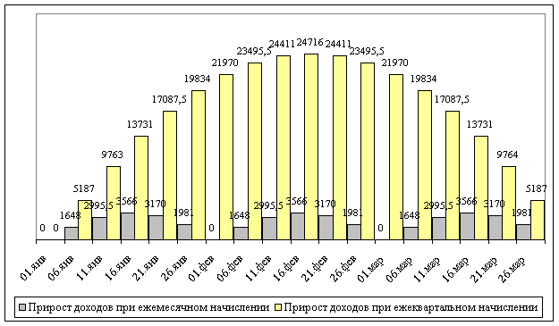 Принципиальной особенностью начисления сложных процентов, как уже отмечалось, является выплата дохода вместе с погашением основного долга. При этом обязательно предполагается наличие промежуточных начислений в течение срока займа. Именно на даты таких начислений происходит нарастание дохода кредитора за счет начисления процентов, именно за счет таких начислений каждое следующее начисление происходит с учетом результатов предыдущего. При ежемесячном начислении это происходит, начиная со второго месяца, при ежеквартальном - с шестого месяца. Последнее доказывает другую принципиальную особенность начисления сложных процентов - скорость роста долга в сложном проценте и, следовательно, общий размер процентного дохода зависят от периодичности его начислений. В конечном итоге на графике 2.2.1 видно, что ежемесячно начислявшиеся сложные проценты выросли за год значительно больше, чем проценты с поквартальным начислением.