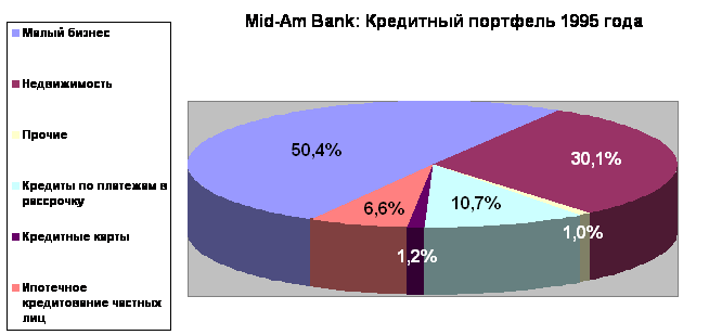 Как мы видим, снову кредитной деятельности Mid-Am Bank образуют ссуды малым предприятиям, составляющие более половины портфеля. Банк также обслуживает несколько крупных предприятий, основная часть которых начала сотрудничать с банком как малые предприятия. Кредитный же портфель Балтийского Банка состоит в основном из крупных кредитов, и только 1,1 % его составляют ссуды малым предприятиям.