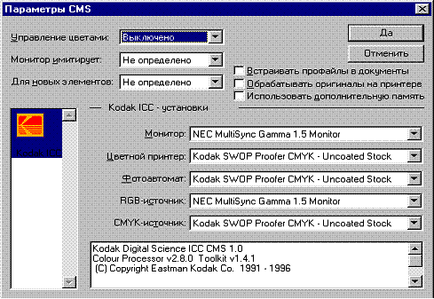 При нажатии на кнопку Параметры CMS будет открыто диалоговое окно с идентичным названием, в котором можно настроить соответствие цветов публикации цветам, получаемым при печати. В Page Maker для решения этой задачи используется метод CMS (Color Matching System), разработанный фирмой Kodak.