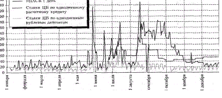 * Ставка MIACR (Moscow Inter Bank Actual Rate) рассчитывается как средне- взвешенная по объемам фактических сделок по предоставлению межбанковских кредитов коммерческими банками. Статистика по предоставлению ЦБР однодневных расчетных кредитов до 25 июня 1998 г. не публиковалась.