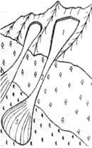 и движется и останавливается снежная лавина, называют лавиносбором. В лавиносборах обычно можно выделить три зоны - зарождения, транзита (пути движения) и отложения (выброса) лавинного потока (см. рисунок). Границы между этими зонами нечеткие и носят условный характер. Так, зона отложения конкретной лавины может стать зоной транзита для более мощной лавины. Зона зарождения лавин (лавинный очаг) расположена в верхней части лавиносбора и представляет собой участок горного склона, где накапливается масса снега, которая может потерять устойчивость и образовать лавину. Чаще всего-это чашеобразное углубление в привершинной части гор типа кара, денудационной воронки или расширенной части эрозионного вреза. Однако лавины могут образовываться и на ровных склонах. Зоны зарождения лавин обычно приурочены к выглаженным склонам без леса крутизной более 30°. Нередки случаи, когда лавины зарождаются на более пологих склонах. Лавины могут возникать и на поросших лесом склонах. На процесс лавинообразования помимо крутизны и характера поверхности склона определяющее влияние оказывает количество и состояние снега.Нарушение устойчивости и образование лавин наблюдается на склонах крутизной от 15 до 60°. На более крутых склонах снег плохо удерживается, большинство снежинок во время снегопада скатывается вниз и большие массы снега откладываются относительно редко. Поэтому окаймляющие верхнюю часть зоны зарождения лавин скалы и крутые участки склонов могут служить источником дополнительного снегонакопления. Наиболее лавиноопасными считаются склоны крутизной от 25 до 50°. Путь движения лавины может быть канализированным в четко выраженном ложе или русле (лавинном лотке), но может располагаться и на относительно ровном склоне между зонами зарождения и отложения лавины. Длина зон транзита у , канализированных лавин больше, чем у неканализи-рованных. Лавинный путь может иметь несколько ветвей, когда в главный канал впадают боковые каналы, каждый из которых начинается в отдельной зоне зарождения лавин. Возможны, правда, случаи, когда несколько лавинных путей питаются из одного лавинного очага. При прохождении слабоканализированных лавин через заросший лесом склон в направлении их движения возникают полосы, лишенные древесной растительности - лавинные прочесы.