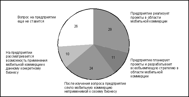 В таких отраслях, как банковское дело, туризм, автомобильная промышленность, а также медиа- и телекоммуникация, мобильная коммерция рассматривается в качестве важной составной части стратегии. Практически все опрошенные предприятия этих отраслей находятся на стадии реализации проектов мобильной коммерции.