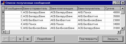 Основными функциями данного окна являются просмотр списка полученных сообщений и подтверждение тех из них, которые удовлетворяют требованиям клиринговой палаты.