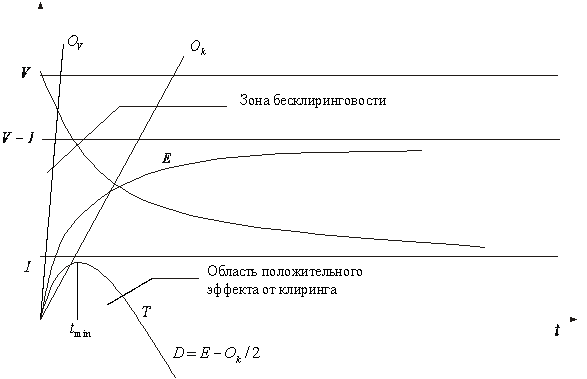 Область возможного положительного эффекта от клиринга задается отрезком времени от 0 до Т. Т есть корень уравнения