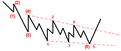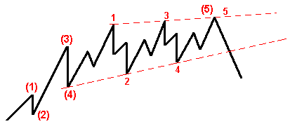 Такая конфигурация появляется на пятой заключительной волне и является моделью "восходящий клин", который всегда является медвежьим. Модель имеет 5 волн, каждая из которых делится на 3 волны. Линии тренда всегда сходятся. Прорыв более крутой является сигналом о значительном повороте рынка.