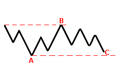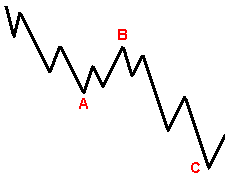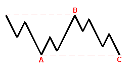 Вершина волны (В) превышает верх волны (А), а волна (С) опускается ниже основания волны (А) для бычьего рынка, и, наоборот, для медвежьего.