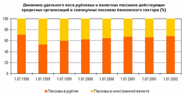 Рост привлеченных объемов депозитов физических лиц наблюдался у 73% действующих на конец 2001 года кредитных организаций, на долю которых приходилось 91,2% совокупных активов банковского сектора. По состоянию на 1.01.2002 г. привлеченные на депозитные счета банков вклады населения составили в реальном исчислении 90,9% (на 1.01.2001 г. – 69,7%) от предкризисного уровня [21].