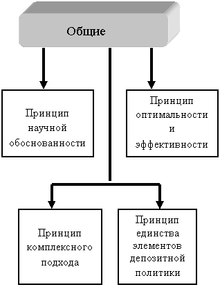 Под общими принципами депозитной политики понимаются принципы, единые и для государственной денежно-кредитной политики ЦБ РФ, проводимой на макроэкономическом уровне, и для политики на уровне каждого конкретного коммерческого банка. К ним следует отнести принципы комплексного подхода, научной обоснованности, оптимальности и эффективности, а также единство всех элементов депозитной политики банка. Комплексный подход выражается как в разработке теоретических основ, приоритетных направлений депозитной политики банка с точки зрения стратегии его развития, так и в определении наиболее эффективных и оптимальных для данного этапа развития банка тактических приемов и методов ее реализации.