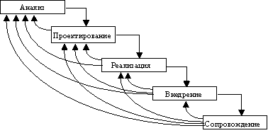 Рис. 1.2. Реальный процесс разработки ПО по каскадной схеме