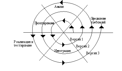 Для преодоления перечисленных проблем была предложена спиральная модель ЖЦ [10] (рис. 1.3), делающая упор на начальные этапы ЖЦ: анализ и проектирование. На этих этапах реализуемость технических решений проверяется путем создания прототипов. Каждый виток спирали соответствует созданию фрагмента или версии ПО, на нем уточняются цели и характеристики проекта, определяется его качество и планируются работы следующего витка спирали. Таким образом углубляются и последовательно конкретизируются детали проекта и в результате выбирается обоснованный вариант, который доводится до реализации.