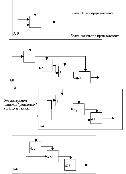 На рисунке 2.2, где приведены четыре диаграммы и их взаимосвязи, показана структура SADT-модели. Каждый компонент модели может быть декомпозирован на другой диаграмме. Каждая диаграмма иллюстрирует "внутреннее строение" блока на родительской диаграмме.