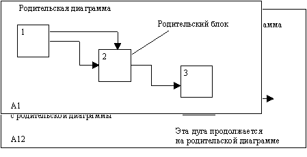 Дуги, входящие в блок и выходящие из него на диаграмме верхнего уровня, являются точно теми же самыми, что и дуги, входящие в диаграмму нижнего уровня и выходящие из нее, потому что блок и диаграмма представляют одну и ту же часть системы.