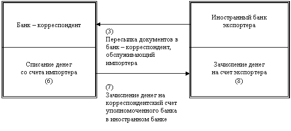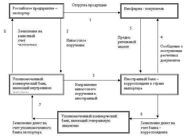 При экспортных операциях инкассовая форма расчетов начинается в уполномоченном банке экспортера, куда экспортер предоставляет все необходимые документы, подтверждающие отгрузку товара и т.п. Предоставляется составленное по форме инкассовое поручение и комплект коммерческих документов в соответствии с условиями контракта. Инкассовые поручения выписываются на специальных бланках в 6 экземплярах. Представленные документы проверяются банком на правильность оформления и взаимную согласованность. После проверки (при отсутствии замечаний) документы направляются в иностранный банк страны-импортера. Если уполномоченный банк экспортера имеет генеральную лицензию, он самостоятельно направляет документы в иностранный банк. Если у банка внутренняя лицензия, то он направляет документы в другой российский банк, у которого есть генеральная лицензия, и который связан корреспондентскими отношениями, с одной стороны, с банком экспортера, и с другой стороны – с иностранным банком. Отосланные в иностранный банк инкассовые поручения учитываются в уполномоченном банке экспортера в специальной картотеке по внебалансовому счету. При получении средств по инкассовому поручению документы из картотеки списываются.
