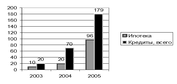 Как мы видим, за последние три года сумма предоставляемых кредитов филиалом значительно возросла: если в 2003 году кредитов было предоставлено на сумму 20 млн. рублей, из них ипотечных кредитов – на 10 млн. рублей, то в 2005 году эти показатели возросли в 9 раз.