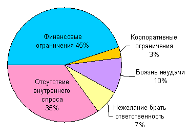 Серьезная система дистанционного обслуживания — с доступом через Интернет, телефон и сервисы сотовых операторов, рассчитанная на обслуживание 1 млн клиентов стоит порядка $5 млн [13]. Но российские банки заказывают куда более скромные проекты: сметы комплексного проекта почти никогда не превышают $250 000. Создание же собственных систем обходится и вовсе дешево — $15 000-20 000. Причины, препятствующие автоматизации клиентских отношений, показаны на рис. 7 [36].