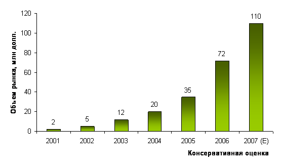 Рис. 3. Объем рынка аутсорсинговых call-центров России (2001-2007 гг.)