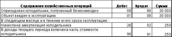 Пример. Один из участников ООО безвозмездно передал предприятию новый холодильник. Рыночная цена 30 000 рублей, в т. ч. НДС. Месячная сумма амортизации 250 рублей.