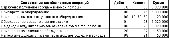 Пример. В январе 2002 года организация получила из бюджета государственную помощь в виде специального оборудования общей стоимостью 6 020 000 рублей (с учетом затрат по его установке 20 000). Оборудование введено в эксплуатацию в феврале. В марте начислена амортизация 50 000.