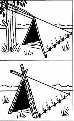 Сооружают сначала крышу, для чего делают нечто вроде решетки. Теперь эту решетку покрывают лапником, ветвями с густой листвой, сеном, кусками коры- словом, тем, что найдешь. Укладывают крышу, начиная снизу, чтобы каждый следующий слой прикрывал предыдущий примерно на середину. Тогда дождь будет стекать по крыше, не попадая внутрь.