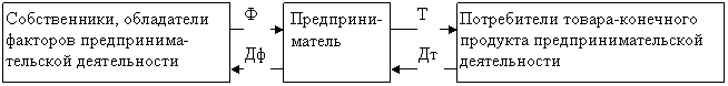 В простейшем случае, когда факторы сами и есть нужные потребителю товары, предприниматель приобретает их и продает потребителю. В подобной ситуации он становится торговым посредником между владельцем товаров и потребителем. Как следует из рассмотренного, схема предпринимательства может быть представлена в виде логической формулы : ДФ - Ф - Т - ДТ. Предприниматель приобретает за деньги Дф средства предпринимательской деятельности Ф, затем преобразует их в товары Т и реализует их, получает в итоге деньги Дт. Вырученные, полученные в итоге деньги Дт должны быть больше денег Дф, затраченных на факторы, с тем, чтобы иметь прибыль.