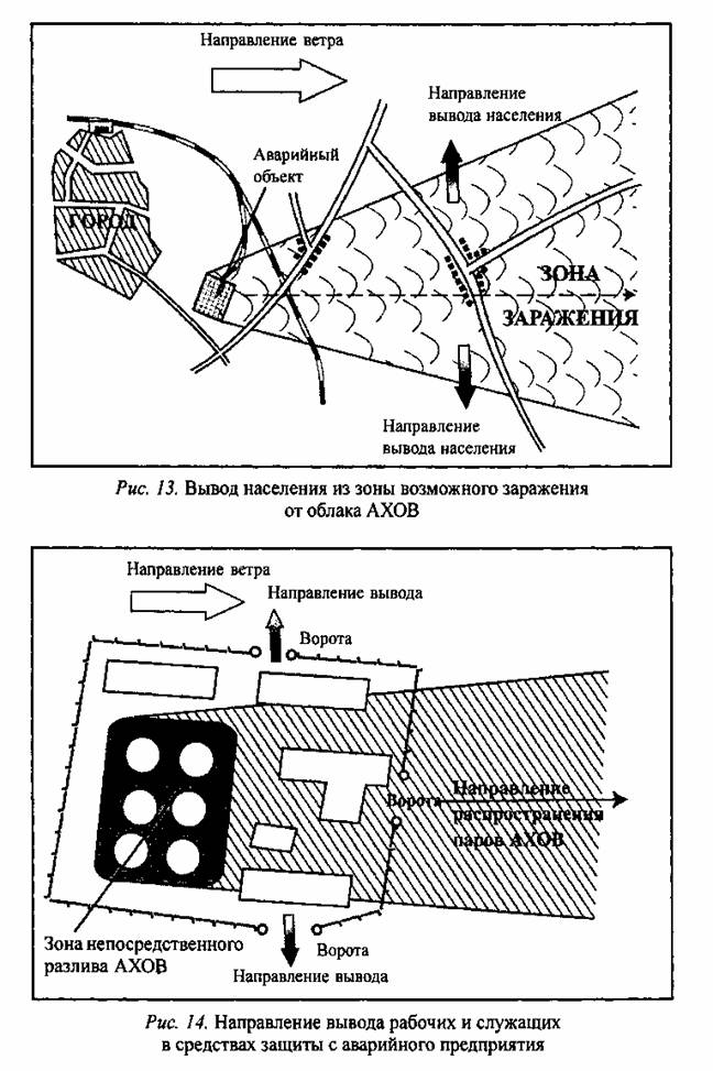 Население, проживающее вблизи химически опасных объектов, при авариях с выбросом АХОВ, услышав информацию, передаваемую по радио, телевидению, через подвижные громкоговорящие средства или другими способами, должно надеть средства защиты органов дыхания, закрыть окна и форточки, отключить электронагревательные и бытовые приборы, газ, погасить огонь в печах, одеть детей, взять при необходимости теплую одежду и питание (трехдневный запас непортящихся продуктов), предупредить соседей, быстро, но без паники выйти из жилого массива в указанном направлении или в сторону, перпендикулярную направлению ветра (рис. 1), желательно на возвышенный, хорошо проветриваемый участок местности, на расстояние не менее 1,5 км от места проживания, где находиться до получения дальнейших распоряжений.