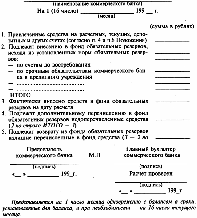 В этом случае коммерческий банк, расположенный на территории Российской Федерации, представляет в соответствующее учреждение Банка России, кроме сводного баланса в целом по коммерческому банку, включая все его филиалы, также баланс без включения в него филиалов, расположенных на территории республик ближнего зарубежья, самостоятельно депонирующих средства в фонде обязательных резервов.