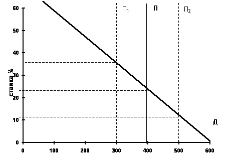 Пересечение спроса на деньги и предложения денег определяют цену равновесия, то есть процентную ставку, уплачиваемую за использование денежных средств. Каким же образом рынок поддерживает равновесие? Что происходит с процентной ставкой? Предположим, что предложение денег уменьшилось с 400 до 300 млрд. грн. (П1). При прежней равновесной ставке 30% теперь нехватка денег составляет 100 млрд. грн. Совместными усилиями компенсировать нехватку денег за счет продажи активов с фиксированным доходом (облигации) увеличивается предложение облигаций и снижается их цена, чем обеспечивается рост доходности облигаций, т.е. процентной ставки. Она составит 35% и, таким образом, увеличатся временные издержки, что означает снижение потребности в деньгах как активе. В результате рынок вернулся к равновесию при денежном предложении 300 и ставке 35%. Аналогично, увеличение денежного предложения до уровня 500 (П2) приводит к избытку денежных средств в сумме 100. Избыточные денежные средства стараются поместить в другие финансовые активы (облигации), что приводит к повышению спроса на них и повышению цены. При фиксированной ставке дохода это означает снижение доходности облигаций до уровня 20%. Снижение временных издержек владения деньгами означает рост готовности обладать наличностью. Таким образом, денежный рынок вновь вернулся к равновесию при ставке процента 20% и денежном предложении 500.