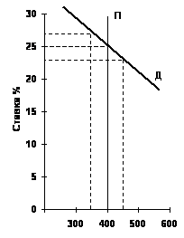 На рис 1.4-а изображен денежный рынок, на котором пересечение спроса и предложения на денежные средства определяют равновесную ставку процента. При данном предложении денег, равном 400млрд.грн. равновесная ставка процента составляет 25%.