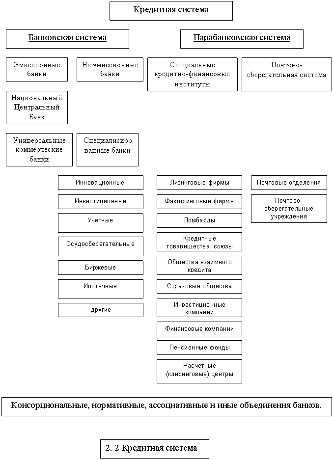 Именно существование конкуренции обусловило появление и широкое применение маркетинга. Кто составляет конкуренцию банку видно из структуры кредитной системы страны, которую можно представить в виде схемы, приведенной ниже. [3]