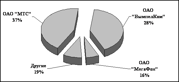 Среди операторов сотовой связи наибольшее количество абонентов имеют ОАО «МобильныеТелеСистемы» (МТС), ОАО «Вымпел-Коммуникации» (торговая марка «БиЛайн») и ОАО «МегаФон», предоставляющие услуги в стандарте GSM и являющиеся операторами федеральной сети (рисунок 3). В сумме они контролируют около 81% рынка сотовой радиотелефонной связи России.