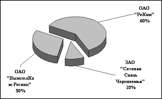 ОАО «РеКом» – это дочерняя компания ОАО «МТС», являющаяся на сегодняшний день в регионе передовой не только сотовой компанией, но и компанией, предоставляющей услуги Интернет-доступа и цифровой связи в формате IP-телефонии. Ее передовые позиции прежде всего обусловлены тем, что данная компания начала внедрение нового стандарта сотовой связи (GSM) именно тогда, когда это было необходимо рынку, что и говорит о его востребованности сейчас, а также тем, что данная организация почти пять лет была единственной компанией в регионе, оказывающая услуги нового стандарта связи, т.е. фактически являясь монополистом в этой среде. В связи с чем по состоянию на 31 марта 2003 года ОАО «РеКом» принадлежит не только большая доля рынка услуг сотовой связи в Орловской области (рисунок 8), но и большая доля (размер) фактического оказания услуг (зона покрытия) в регионе (приложение П, рисунок П.1).