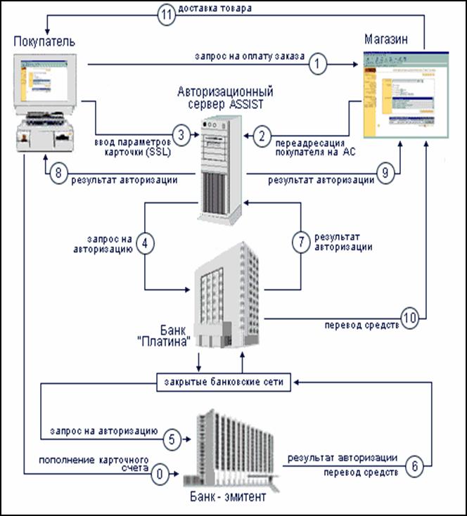 12) Покупатель через Интернет подключается к web-серверу магазина, формирует корзину товаров и выбирает форму оплаты по кредитным карточкам.