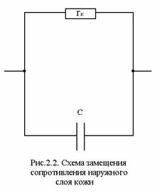 Между воздействующим током и напряжением существует нелинейная зависимость: с увеличением напряжения ток растет быстрее. Это объясняется главным образом нелинейностью электрического сопротивления тела человека. На участке между двумя электродами электрическое сопротивление тела человека в основном состоит из сопротивлений двух тонких наружных слоев кожи, касающихся электродов, и внутреннего сопротивления остальной части тела. Плохо проводящий ток наружный слой кожи, прилегающий к электроду, и внутренняя ткань, находящаяся под плохо проводящим слоем, как бы образуют обкладки конденсатора емкостью С и сопротивлением его изоляции Vн (рис.2.2.). С увеличением частоты тока сопротивление тела человека уменьшается и при больших частотах практически становится равным внутреннему сопротивлению.