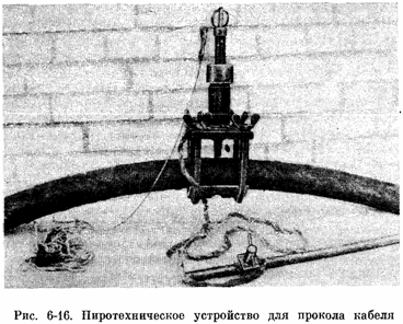 Выпускаемое промышленностью устройство с изолированной штангой и сверлом громоздко и может применяться только в траншеях. В ЛКС совместно с трестом № 45 Главзапстроя разработано пиротехническое устройство, которое обеспечивает прокол ленточной брони и оболочки до жил с замыканием их между собой и на землю. Устройство может применяться в любых условиях. На плите устройства (рис. 1-7) установлен ствол, в котором имеется патронник и поршень с пробойником, затвор с кольцом для завода в боевое положение, фиксация которого производится с помощью чеки. Устройство закрепляется на кабеле с помощью хомутов.