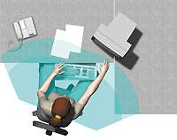 Здесь однозначно приходится располагать монитор в углу стола. Значит, у пользователя вскоре появится ярко выраженная левая или правая ориентация, а что это влечет за собой с медицинской точки зрения, можно прочесть на указанном выше сайте или со временем узнать у терапевта. Небезопасно и разъезжать по комнате за дискетами и книгами на стуле с колесиками, если он, конечно, есть. Возможно, это и развлекает, но сбивает с рабочего ритма, а порой может привести к травмам.