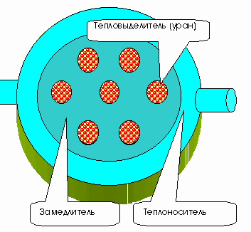 Как уже указывалось, тремя обязательными элементами для реакторов на тепловых нейтронах являются тепловыделитель, замедлитель и теплоноситель. На данном рисунке представлена типичная схема активной зоны.