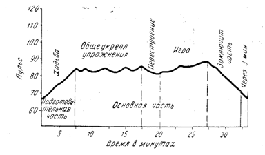 Кривая физиологической нагрузки постепенно возрастает к началу основной части урока, достигает своей кульминационной точки в середине урока и постепенно снижается в заключительной части урока (рис. 1).