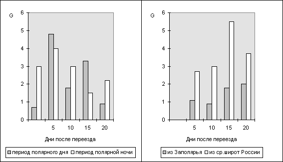 При анализе веса корреляционного графа в группах лиц, приехавших в г.Сочи из Заполярья и из средней полосы нашей страны, получены следующие результаты: во все дни обследования скоррелирован-ность показателей активности ферментов лейкоцитов у норильчан выше; наиболее высоких значений вес корреляционного графа достигает на 15-й день пребывания у Черного моря; к 20-му дню у жителей Заполярья он достигает начального уровня (рис. 2).