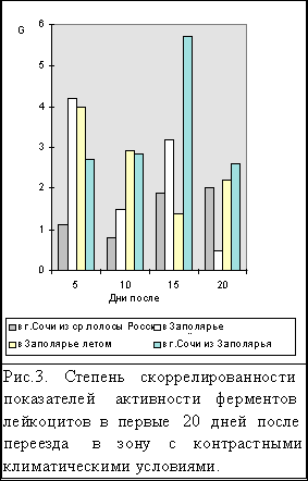 Рис.2. Степень скоррелированности показателей активности ферментов лейкоцитов у приезжих в г.Сочи в первые 20 дней после переезда. |