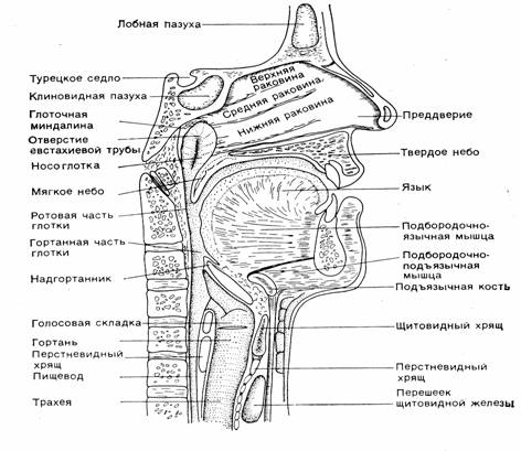 Гортань лежит между трахеей и корнем языка. Полость гортани разделена двумя складками слизистой оболочки, не полностью сходящимися по средней линии. Пространство между этими складками - голосовая щель защищено пластинкой волокнистого хряща - надгортанником (рис. 2 ). По краям голосовой щели в слизистой оболочке лежат фиброзные эластичные связки, которые называются нижними, или истинными, голосовыми складками (связками). Над ними находятся ложные голосовые складки, которые защищают истинные голосовые складки и сохраняют их влажными; они помогают также задерживать дыхание, а при глотании препятствуют попаданию пищи в гортань. (рис. 1 ) Специализированные мышцы натягивают и расслабляют истинные и ложные