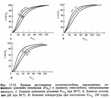 Соотношение между числом свободных молекул О2 и числом молекул, связанных с гемоглобином (НbО2), описывается кривой диссоциации О2 (рис.7). НbО2 может быть представлен в одной из двух форм: или как доля соединенного с кислородом гемоглобина (% НbО2), или как объем О2 на 100 мл крови во взятой пробе (объемные проценты). В обоих случаях форма кривой диссоциации кислорода остается одной и той же.