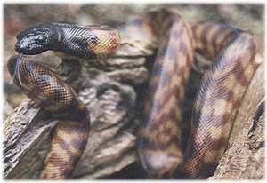 ПИТОН РОМБИЧЕСКИЙ (Morelia argus) до недавнего времени считался членом другого рода и назывался Python spilotes. Окраска ромбического питона яркая и изменчивая, состоит из основного голубовато-черного фона, по которому разбросаны ярко-желтые ромбические пятна. Хорошо выделяется особая цветовая вариация ромбического питона, называемая ковровой змеей (М. a. var. variegata) и слегка похожая по рисунку туловища на иероглифового питона. Ромбический питон распространен в Австралии и на Новой Гвинее, причем вполне обычен в сырых равнинных местах, чаще близ воды, особенно в сухие периоды года. Длинный и цепкий хвост помогает змее очень ловко лазать по деревьям. Кормится он мелкими сумчатыми, грызунами и птицами, а крупные (около 3 м) змеи охотятся на многочисленных в Австралии кроликов. В амбарах и на складах уничтожает мышей и крыс. При содержании в неволе эти красивые змеи быстро привыкают и хорошо едят, но живут в неволе 1—2, максимум 4 года.