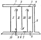 Четырехкоридорный аэротенк может работать с отдельной регенерацией ила и без нее. Если аэротенк работает без отдельной регенерации, то сточная вода из первичных отстойников поступает в распределительный канал 1 перед аэротенками, затем при открытом шибере на водосливе 2 проходит через аэротенк и по каналу 5 – в распределительный канал 8 за аэротенками, после чего подается через водослив или затопленное отверстие 10 в коридор I. Возвратный ил из вторичных отстойников подается в коридор I по трубопроводу. Иловая смесь, пройдя последовательно коридоры I, II, III и IV, дюкером отводится во вторичные отстойники.