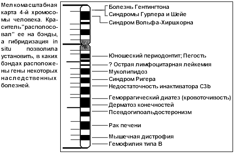 Средний размер бэнда – около 10 Мб: такова и точность хромосомной карты. Правда, позднейшее усовершенствование – гибридизация с флуоресцентной меткой (FISH – fluorescent in situ hybridization) – повысило разрешение до 5-2 Мб. Более того, разработан даже метод гибридизации меченых генов с хромосомами, извлеченными из ядра неделящейся клетки – и значит, де конденсированными, "развинченными", а не упакованными в компактные образования. В итоге удалось локализовать участки до 0,1 Мб.