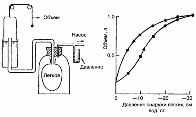 Крутизна кривой "давление-объем", т. е. изменение объема на единицу изменения давления, называется растяжимостью. В физиологических условиях (если растягивающее давление составляет от -2 до -10 см вод. ст.) легкие обладают удивительной растяжимостью. У человека она достигает примерно 200 мл/см вод. ст., однако при более высоких давлениях уменьшается. Этому соответствует более пологий участок кривой "давление-объем".