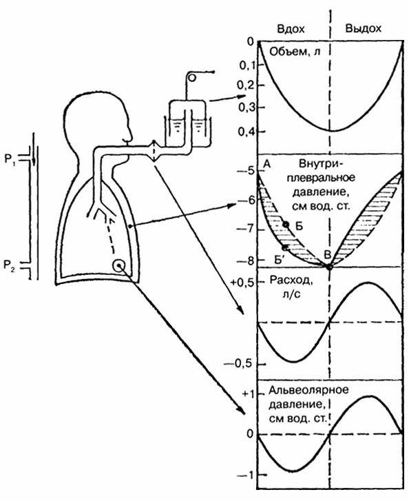 Рис. 6. Изменение давления во время дыхания. При отсутствии аэродинамического сопротивления альвеолярное давление было бы всегда равно нулю, а внутриплевральное изменялось бы в соответствии с пунктирной кривой АБВ (то есть под действием лишь эластической тяги легких). Поскольку же дыхательные пути (и ткани) обладают вязким сопротивлением, внутриплевральное давление изменяется по сплошной кривой. "Вкладу" этого сопротивления соответствует заштрихованный участок