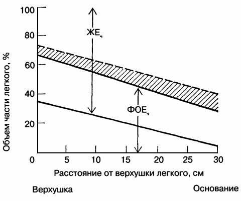 Рис. 7. Объем части легкого, способный к расширению, то есть жизненная емкость части (ЖЕч). Верхушка легкого показана в левой части графика ФОБ - функциональная остаточная емкость